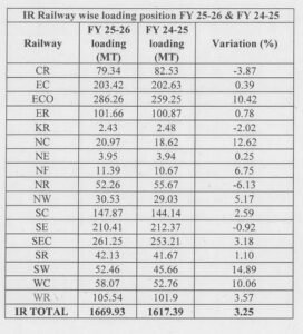 Infrastructure-linked commodities continued to remain major contributors to the freight surge. Iron ore loading increased by 6.74 percent to 190.12 MT, while cement transportation rose by 4.74 percent to 157.17 MT. These numbers reflect sustained momentum in construction, real estate and infrastructure development projects across India.